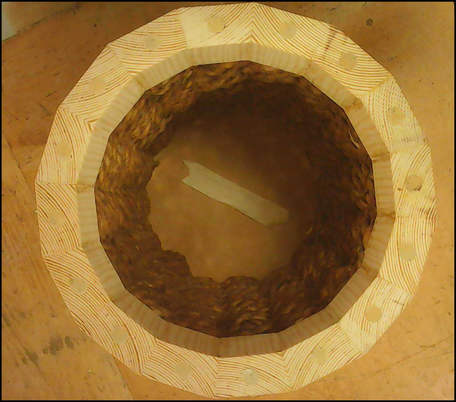 Weaved Bin: View of Bottom with Dowels Glued into Base.